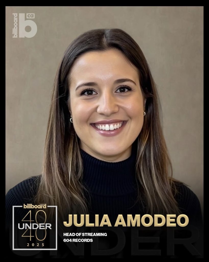 We’re thrilled to share that our very own Julia Amodeo, Head of Streaming at 604 Records, has been named to Billboard Canada’s inaugural Top 40 Under 40 list! The list celebrates the next generation of visionaries shaping the future of music, and that’s exactly what Julia does every day. Her leadership, creativity, and drive have helped shape our streaming department and strengthen how our artists connect with listeners across the globe.